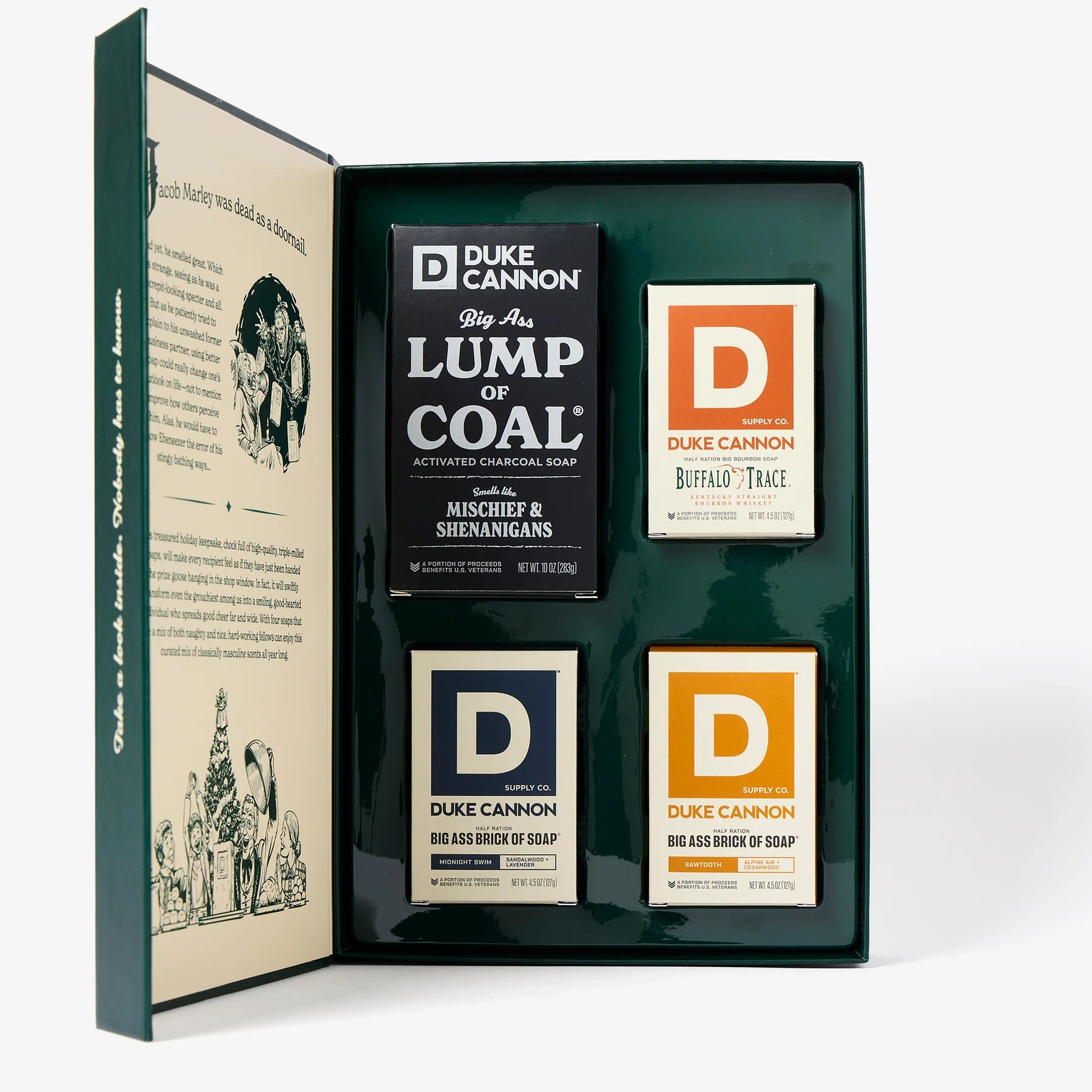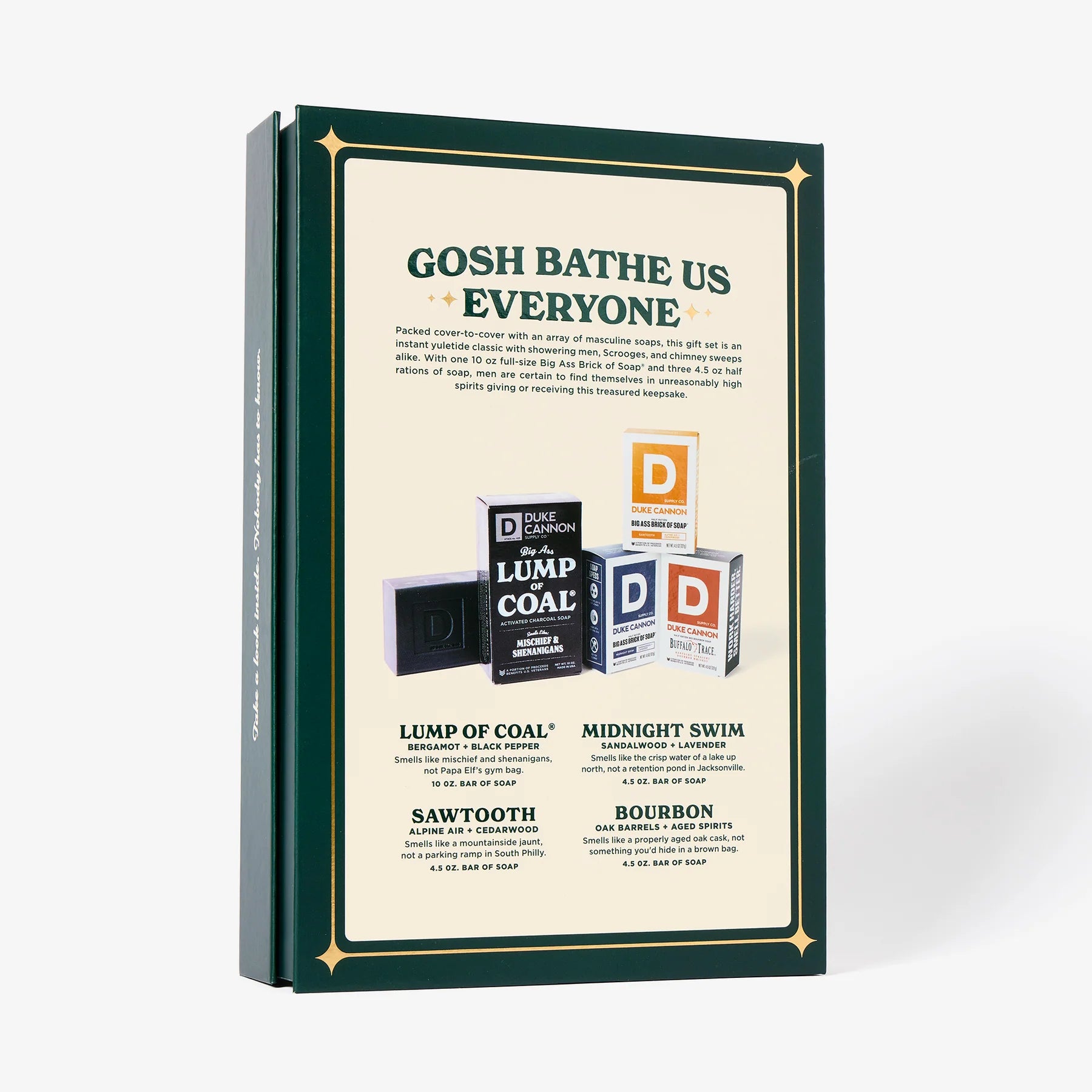 Packed cover-to-cover with a curated collection of masculine soaps, Duke Cannon's Naughty & Nice gift set is an instant holiday classic that looks just as great as it smells. With one 10 oz. Big Ass Brick of Soap and three 4.5 oz. half rations, this handsome book is equally at home on a mahogany bookshelf as it is in your bathroom (which is where you probably do most of your reading anyway).