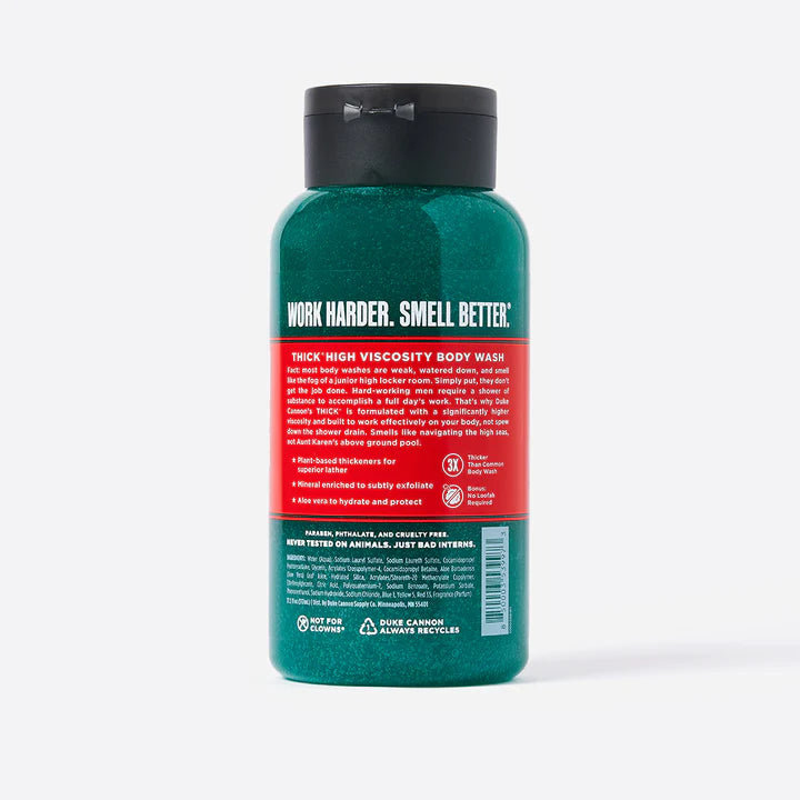 That's why Duke Cannon's THICK is formulated with a noticeably higher viscosity and built to work effectively on your body, not spew down the shower drain.