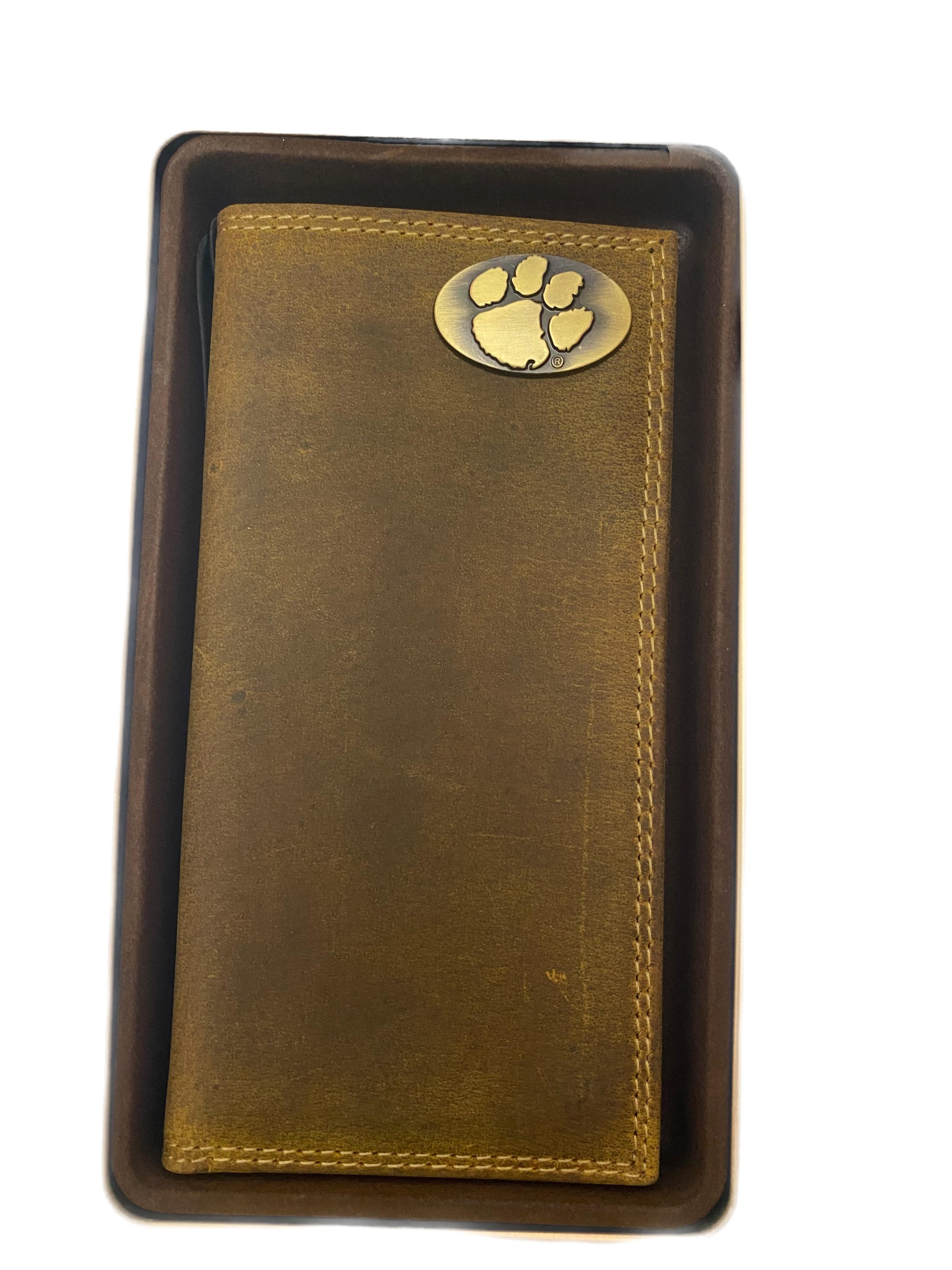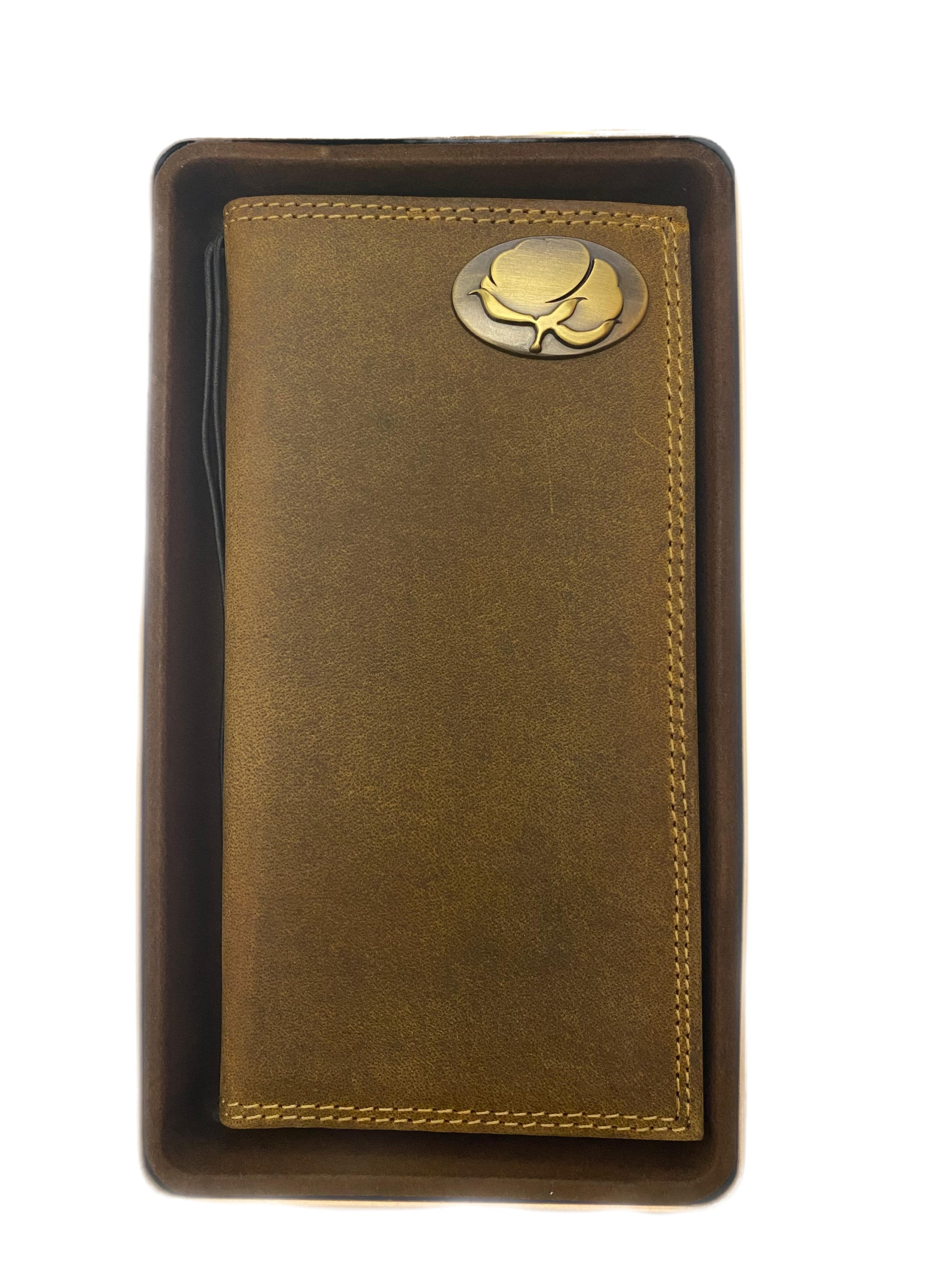 Vintage tan crazy horse roper wallet with brushed brass concho